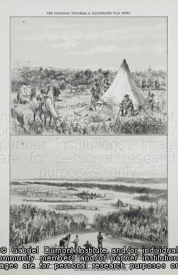 In the 19th century – before our modern media infrastructure was in place – major events were told through word of mouth, telegraphs, but mostly via print media. The events were often told days, weeks and even months after they occurred. Dailies, weeklies and monthly journals did the lion’s share of this reporting. After Confederation, this tradition in Canada was most evident with the Canadian Illustrated News that was published in Montréal, Québec by Georges Desbarats from 1869 to 1883. This publication was replaced by The Canadian Pictorial and Illustrated War News, which was published by the Grip Printing and Publishing Company in Toronto, Ontario. This publication used a variety of biased, imagined artistic representations of the battles and personalities of the 1885 Resistance. “The 1885 Campaign was fought in a time of transition from the pen-and-ink sketch and watercolour school of visual reporting of military events, with all its attendant bias and glorification of war, to the photographic report with more subtle but equally strong biases. The Illustrated War News represents the older approach”. (https://www.collectionscanada.gc.ca/military/025002-4080-e.html). The Gabriel Dumont Institute acquired this collection in April 2004 through a special fund of the Government of Canada.