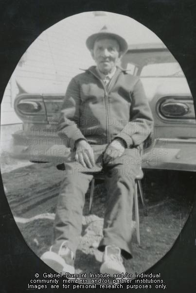 | Description: | Photograph of Gabriel Arcand sitting in a metal chair behind a car. Gabriel is wearing a hat, a zippered jacket, pants, and sneakers with the tongues hanging out. Gabriel is John Arcand’s uncle. Gabriel was born in the 1890s and died ca. 1964. |
