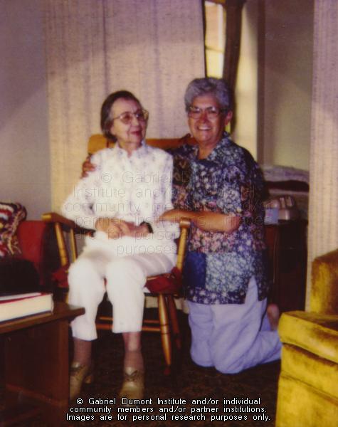 Photograph of Margaret Welsh-Barnett and Billie Robison (Welsh). Margaret is seated in a wooden rocking chair and she is wearing white pants and a white printed blouse. Billie is kneeling next to her with her arm around her, and she is wearing purple pants and a blue and purple printed blouse. |