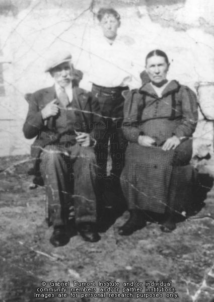 Description: Photograph of the family of Louis Nolin, an older couple seated in front of a younger man, probably Louis. Louis is wearing a white button-up shirt and dark pants. The man is wearing a suit and tie, and he is holding a pipe. The woman is wearing a dark chequered dress.