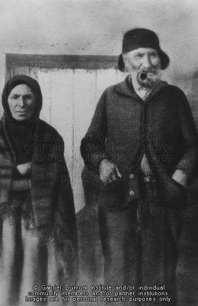 Photograph of Caroline Lafleur and Joseph Bouvier Sr. standing in front of a wooden structure. Joseph is smoking a pipe, and he is wearing a sweater over a striped shirt and a hat with ear flaps. Caroline is wearing a skirt and a shawl. Joseph and Caroline are Rita Bouvier's great grandparents. |