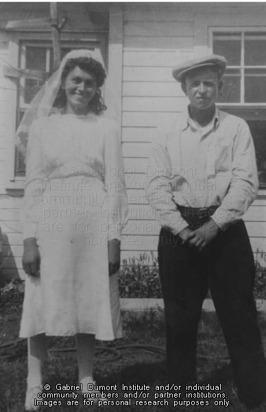 Description: Photograph of a Pauline (Maurice) and Melchoir Bouvier posed in front of a house. Pauline is wearing a wedding dress and veil and is standing with her arms at her sides and smiling. Melchoir is standing with his hands together and he is wearing pants, shirt and a hat. There is a flower bed and a garden hose visible in the background. Pauline and Melchoir are Rita Bouvier's aunt and uncle.