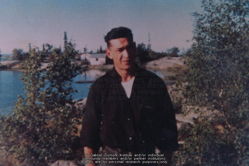 | Description: | Photograph of Eugene Gardiner posed outdoors beside some trees, in front of a body of water with some houses in the background. Eugene is wearing a dark coloured button up shirt and dark coloured jeans. He is Rita Bouvier's cousin. |