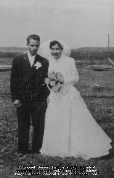 Photograph of Monique (McIntyre) and Nap Bouvier posed outdoors. Nap is wearing a black suit with a white boutinaire. Monique is wearing a long white gown and veil and she is holding a bouquet of flowers. There is a wooden structure visible in the background. |