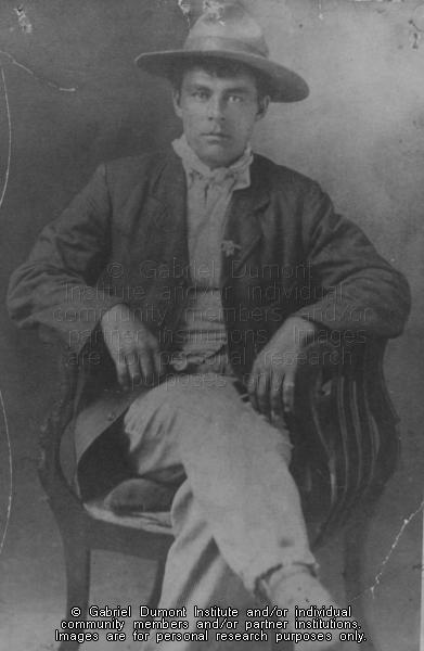 Description: Photograph of Billie Gardiner sitting in a chair, in what appears to be a photography studio. He is wearing a wide brimmed hat, shirt, pants, and a jacket. Billie is Flora Bouvier's younger brother. According to memory he was killed in a hunting accident, or fell through some ice.