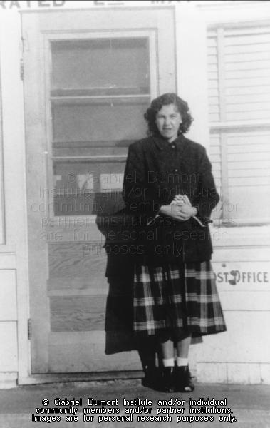 Description: Photograph of Margaret Mary (Laliberte) Roy standing in front of a post office building. She is wearing a plaid patterned skirt and a dark jacket. She is also holding something in her hands in front of her.