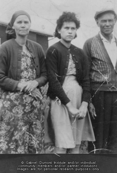 Description: Photograph of Flora, Annie and Joseph Bouvier. The women are both wearing dresses with sweaters over top. Flora is wearing a scarf on her head. Joseph is wearing a shirt and pants with a sweater over top. He is also wearing a hat. There is a house partially visible in the background. Annie is Rita's mother, and she is now Opikakew. Flora's maiden name is Gardiner, and Joseph is Michelis' son.