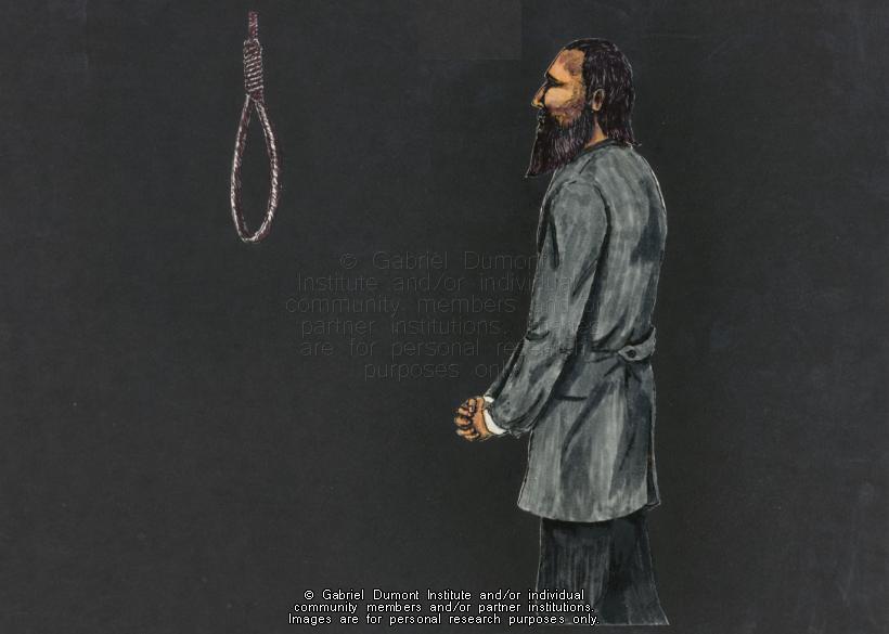 | Description: | Illustration of Louis Riel as he appproaches the noose for his execution from "Gabriel Dumont: Métis Legend". |