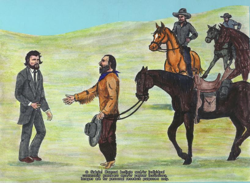 Illustration of Gabriel Dumont and his party in Montana recruiting Louis Riel to help them in Batoche from "Gabriel Dumont: Métis Legend". |