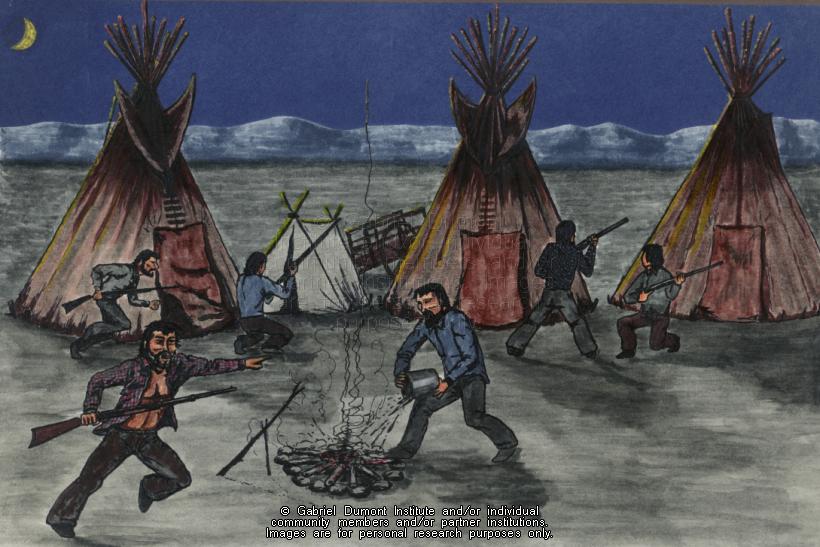 | Description: | Illustration of Métis preparing to defend their camp from outside attack from "Gabriel Dumont: Métis Legend". |