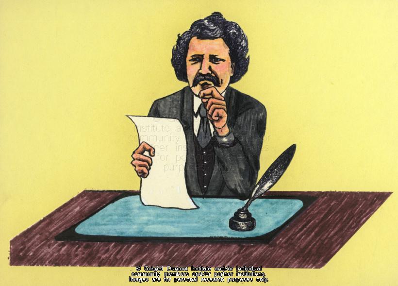 | Description: | Illustration of Louis Riel making a list of rights to send to the federal government, from Gabriel Dumont: Metis Legend". |