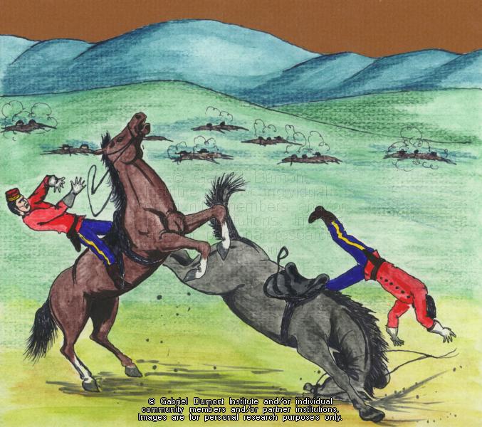 | Description: | Illustation of two North West Mounted Police Men being shot by Métis in rifle pits from "Gabriel Dumont: Métis Legend". |