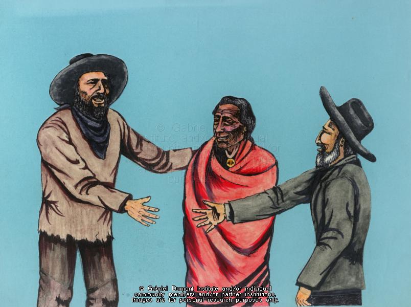 Description: Illustration of Gabriel Dumont meeting with Big Bear and Hudson Bay Company trader Joe Mackay.