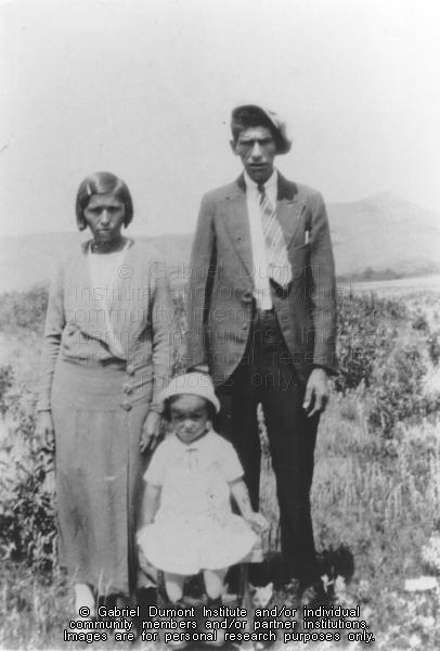Description: Photograph of the Perrault family posed outdoors in a field. The man is wearing a suit and tie, the woman is wearing a dress and has a barrette in her hair, and the little girl is wearing a white dress and hat. The little girl is sitting on a stool, and there is a little white cat underneath the stool.
