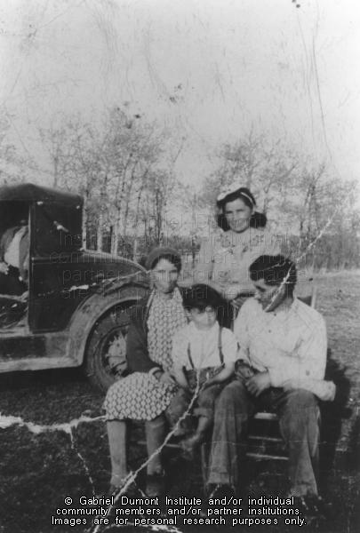Description: Photograph of the Swain family from Bradenberry near Yorkton. The photo includes a man, two women, and a little boy next to a car with a man sitting inside. The woman standing behind the others is wearing a dress with some kind of ornamentation around the neckline. The others are sitting on wooden chairs, with the woman on the left, the boy in the middle, and the man on the right. This woman is wearing a patterned dress, the boy is wearing suspenders with his pants and shirt, and he has his pants rolled up at the bottom above his bare feet. The other man is wearing a white button-up shirt, and he is turned towards the little boy.
