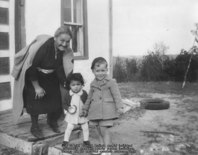 | Description: | Photograph of two children and an old woman on the front steps of a house. The woman is wearing a black dress with a white belt, and she has a jacket thrown over her shoulders. The little girl is wearing a white dress, dark sweater, and is holding what appears to be a cup. The little boy is wearing a light coloured coat, shorts and a hat, and is holding the little girl’s hand. |
