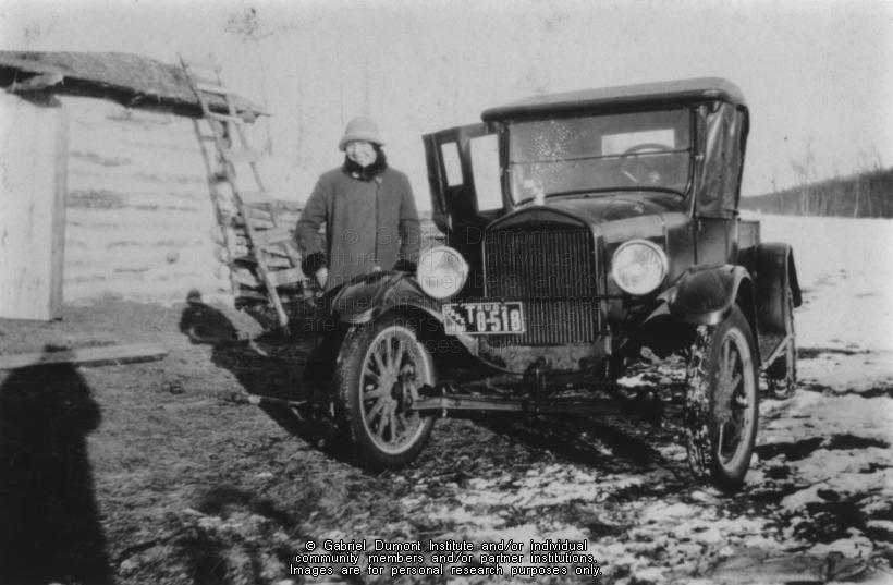 | Description: | Photograph of Mammie Laplante taken outdoors posed beside a car in front of a building with a ladder leaning against it. Mammie is Frances’ sister. |