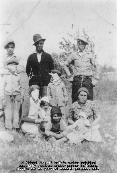 | Description: | Photograph of Joe and Bertha Rose (Gilbert Rose’s parents) and their family. There are three men and two boys standing in the back and the two women are seated in front. One woman is holding an infant and the two girls are sitting in between the women. The man in the middle back might be Joe and the woman holding the infant might be Rose, although it is unclear. |