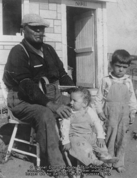 Photograph of Pete Cardinal and two children in front of a house. Pete is sitting on a wooden chair and the youngest boy is sitting on a small wooden chair. The older boy is standing beside them. Pete is wearing a dark button-up shirt with armbands on each sleeve, pants with suspenders, and it appears he is wearing moccasins. He has a cane and he is smoking a cigarette in a holder. The boys are both wearing overalls, and the oldest boy has bare feet. |
