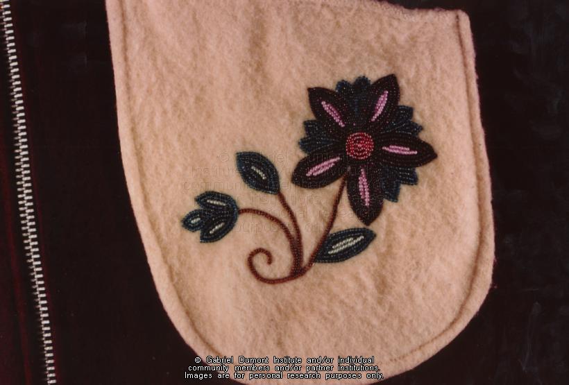 Description: Photograph of beadwork detail from the pocket of a coat made by Isabelle Impey (Dorion) of Cumberland House, Saskatchewan. The beadwork is done in a Dene style. The coat belongs to Angela Sinclair.