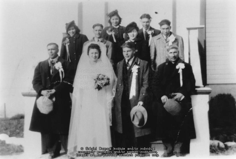 Photograph of James and Stella Lavalley's wedding, Crooked Lake, SK. They are posed outdoors on the steps of a building, perhaps the church. They are all wearing jackets, except for the bride, who is wearing her white dress and veil. The bride and groom are at the front and centre of the photo, and the couple also appear in GDI.HP.0004. |