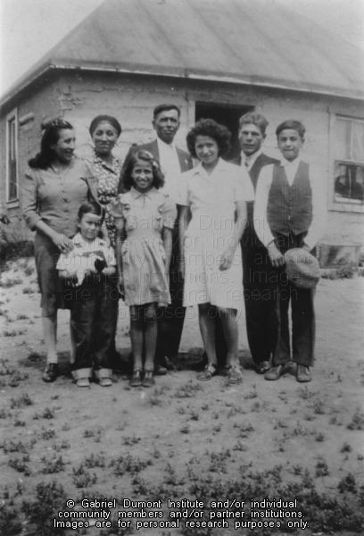 Photograph of a family of eight, including Alice and her son John Flamont, posing in front of a home in Crooked Lake. The women are wearing dresses and the men are wearing suits. The little boy appears to be holding a puppy. Alice and John also appear in GDI.HP.0005. |