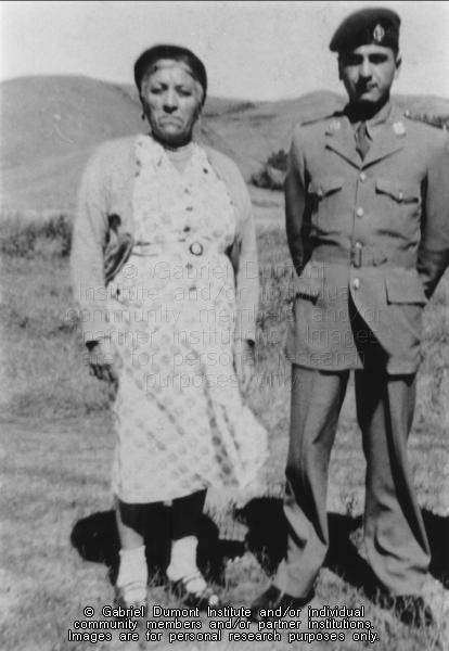 Photograph of Alice Flamont and her son John. He is wearing his military uniform from World War II, and she is wearing a printed dress and a pearl necklace. Alice and John also appear in GDI.HP.0004. |