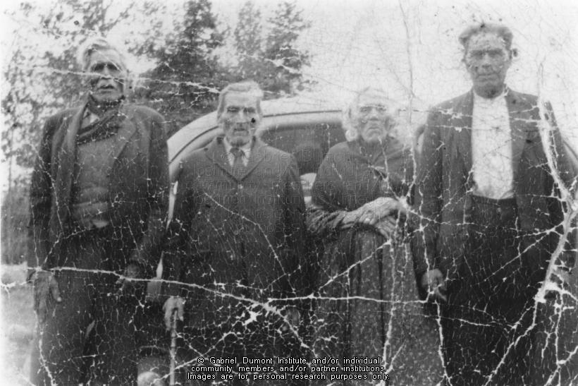 Photograph of Flamonts (left to right), Max, Andrew, Sister (?), and Alice posed in front of a car. Sister Flamont is wearing a shawl over her dress and the men are wearing suits. Andrew is holding a cane. |