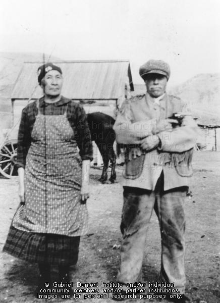 Photograph of Theresa Delorme (Pelletier) and Alfred Pelletier. They are posed outdoors; Alfred is holding a gun and wearing a fringed jacket, and Theresa is wearing a patterned apron over a plaid dress. They are standing in front of a building, a horse and a cart. |