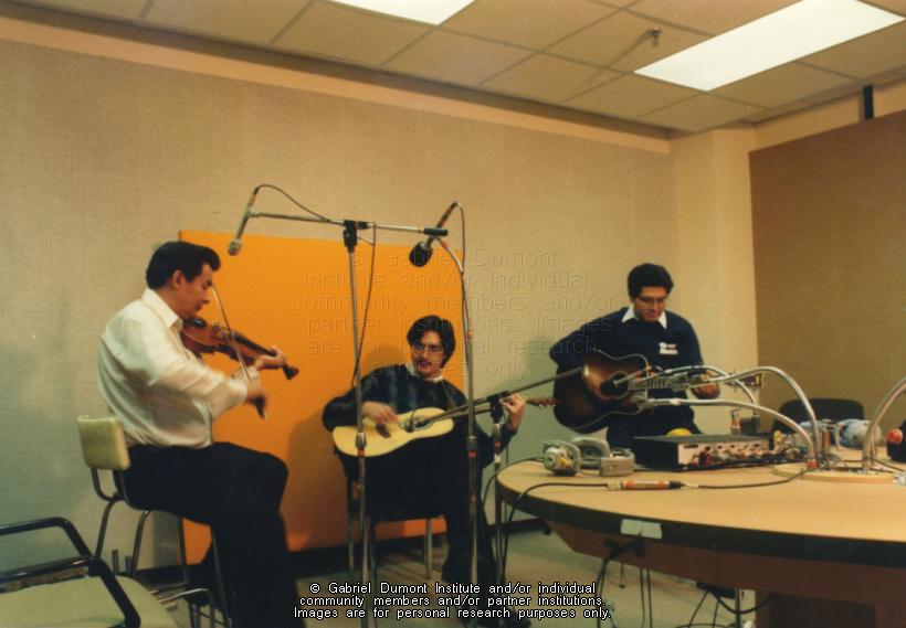 Description: Photograph of Ed Lafferty on fiddle, Herb Lafferty on guitar, and his cousin George Tuccaroo on guitar (on the right). and two men playing guitar. They are playing indoors at the CBC North Studio in Yellowknife, NWT. This photo was taken in March 1988.