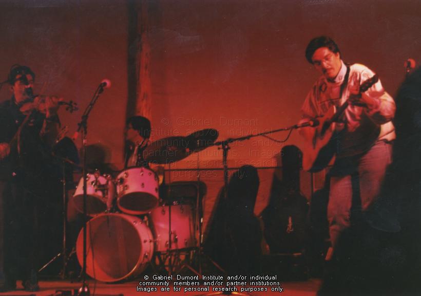 Description: Photograph of Ed Lafferty on the fiddle and Herb Lafferty on the guitar. They are performing at an entertainment gala on the occasion of the Papal visit to Fort Simpson, NWT in September, 1987.