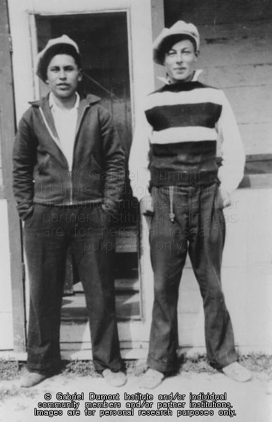 Description: Photograph of Danny Bouvier and Mr. Loutit (first name unknown) posed outdoors in front of a wood plank house. They are both wearing pants and hats, Danny is wearing a zippered jacket, and Mr. Loutit is wearing a striped sweater.