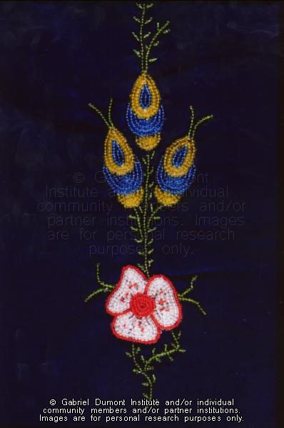 | Description: | Photograph of beadwork detail from a vest made by Isabelle Impey (Dorion) of Cumberland House, Saskatchewan. This vest belonged to Louis Dorion. |
