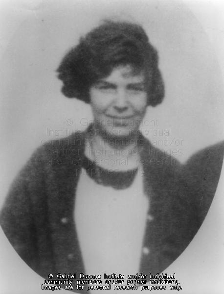 | Description: | Photograph of Marian Eleanor Welsh (Amyotte). Marian is Billie Robison (Welsh)'s mother. She was married to Joseph Welsh from the Qu'Appelle Valley. Marian was born in 1911 and died in 1950; she is buried at Lebret. This appears to have been taken outdoors, because there is wind moving her hair around. |