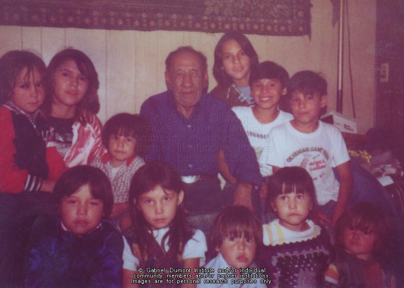 This is a photograph of Roy Brazeau and his two daughters, Belinda (pink jacket) and Charlene (to Stanley’s left) with other children.Corrected information for this photograph was provided by Kayla Brazeau, Belinda’s daughter. |
