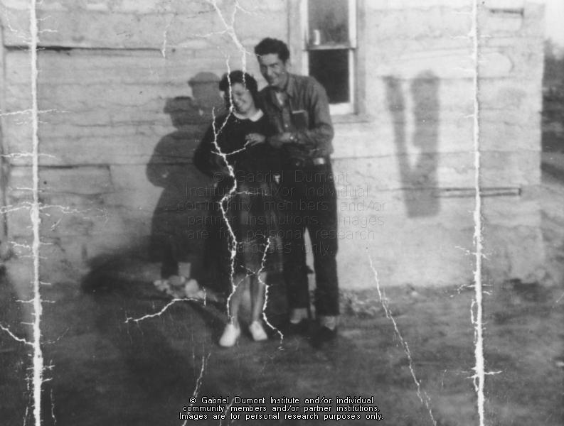 Photograph of Isabelle Pelletier posed with a man in front of a house. She is wearing a plaid skirt and a sweater and he is wearing jeans with the cuffs rolled up and a buttoned shirt. |