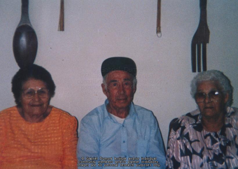 | Description: | Photograph of a man with a woman on either side of him, posed indoors, in front of a wall that has a large fork and spoon hanging on it. The woman on the left is wearing a bright orange outfit, the man is wearing a blue button-up shirt and a hat, and the woman on the right is wearing a black printed outfit. |