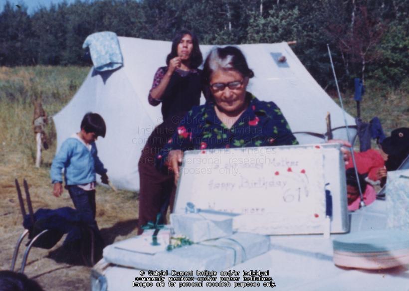 | Description: | Photograph of Isabelle Pelletier (née Flamont) at her 61st birthday celebration. She is holding up a cake, which says, “To our loving Mother, Happy Birthday 61, Many more”. She is in front of a table with presents on it, and there is a tent set up in the background. There are several people in the background including a woman and a young boy. |