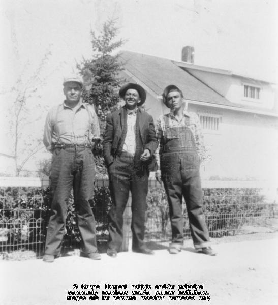 Description: Photograph of three men posing in front of a house. They are standing right in front of the wire fence and hedges. The man on the right is wearing overalls, and the other two men are wearing pants and button-up shirts.