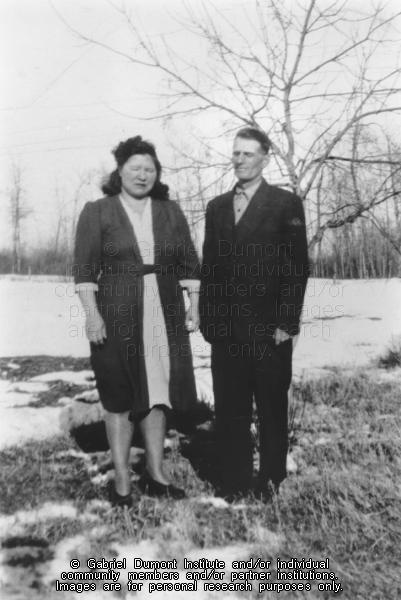 In this photograph, "Bill" (Henry William) and Athalie Rose (née Pelletier) Spreacker (other spellings include "Sprecher" and "Spraker") are standing outdoors in a snowy field with their eyes closed. Athalie went to the Lebret Residential School. This information about this couple was provided by their grandchildren, Amy and Marty Spreacker. |