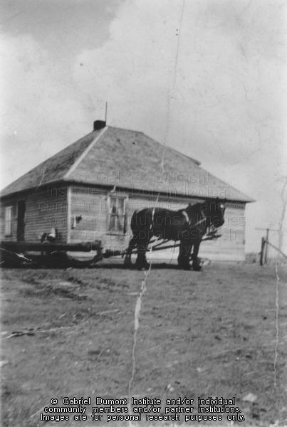 Description: Photograph of a workhorse pulling a cutter in front of a log house.