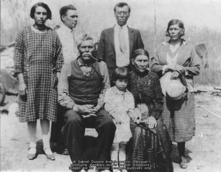 Description: Photograph of the St. Pierre family posed outdoors. There are two men in the centre back wearing shirts and ties, and two women on either side of them to the far left and the far right. They are both wearing dresses in a chequered pattern. In the front are an older man and woman, both seated, with a young girl standing between them. The old man is smoking a pipe and he is wearing a shirt and vest. The old woman is wearing a dark coloured dress and she is holding the little girls hand.
