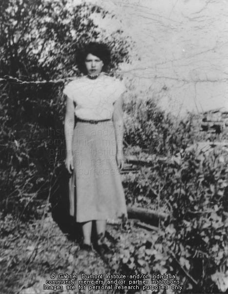 Photograph of Rose Adele St. Pierre (née Pelletier) posed outdoors in front of some bushes. She is wearing a long skirt and a short sleeved light coloured blouse. |