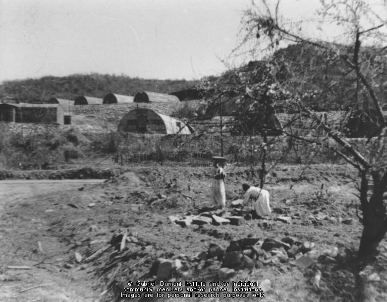 Photograph of the Crooked Lake farm project. There are several buildings in the background, and there are two women in the foreground moving some large rocks. They are both wearing light coloured dresses. |