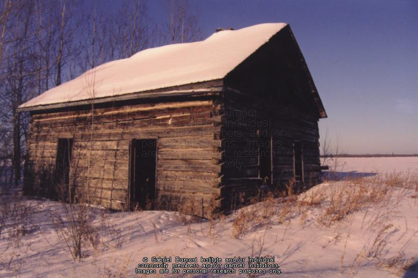 | Description: | Photograph of an old Road Allowance home with snow on the roof. |