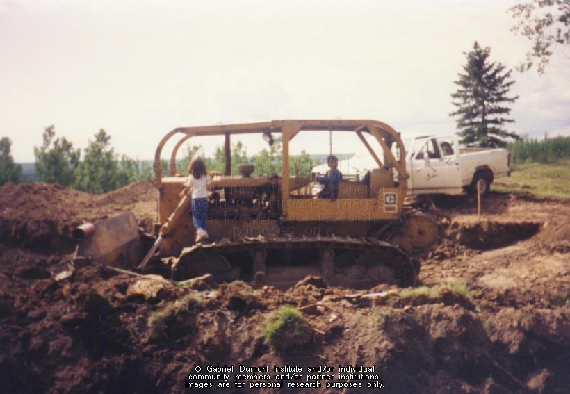 Photograph of two children playing on a CAT dozer used to grade the land. This is the start of building for a community centre for Carcajou, Alberta. Carcajou had no store or community centre, and it was a 50 km drive to the nearest store. |