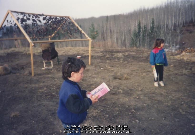 Photograph of Larry Chartrand's niece Melissa and his nephew Louis outside with their Easter candy. They are at Larry's parents place at the Paddle Prairie Metis Settlement. |