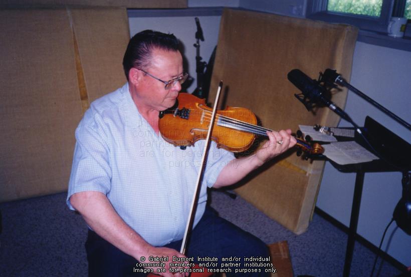 | Description: | Photograph of Métis fiddler Richard Lafferty Sr., of Hay River, NWT recording fiddle music. |
