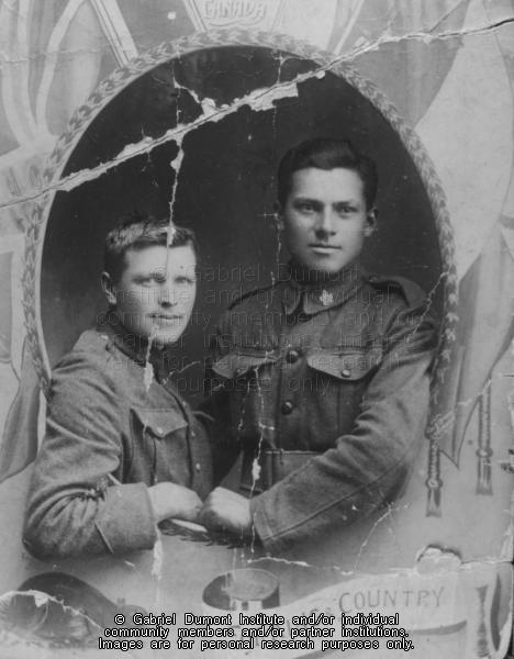 | Description: | Photograph of two brothers, Pte. George Montour (left) and Pte. William Montour, in World War I military uniforms. They are posed in a cut-out background that reads "For King and Country", has a crown, a maple leaf, and the word Canada in the top centre, and has an image of a beaver on the lower left. |