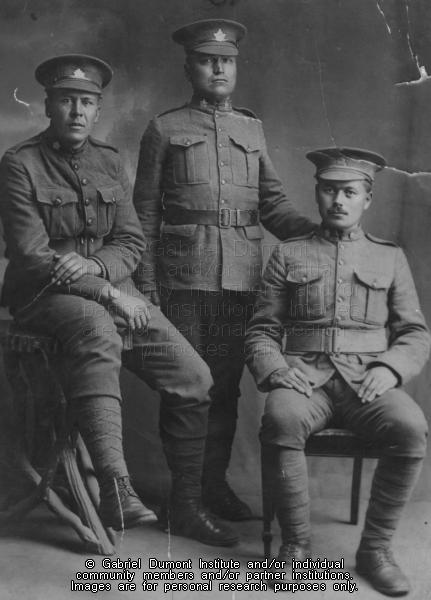 Photograph of (left to right) Pte. Jules Haggerty, Pte. Chartrand, and Pte. Gaudry just prior to leaving for Europe in 1918. The men appear to be posed in a photographers studio. |